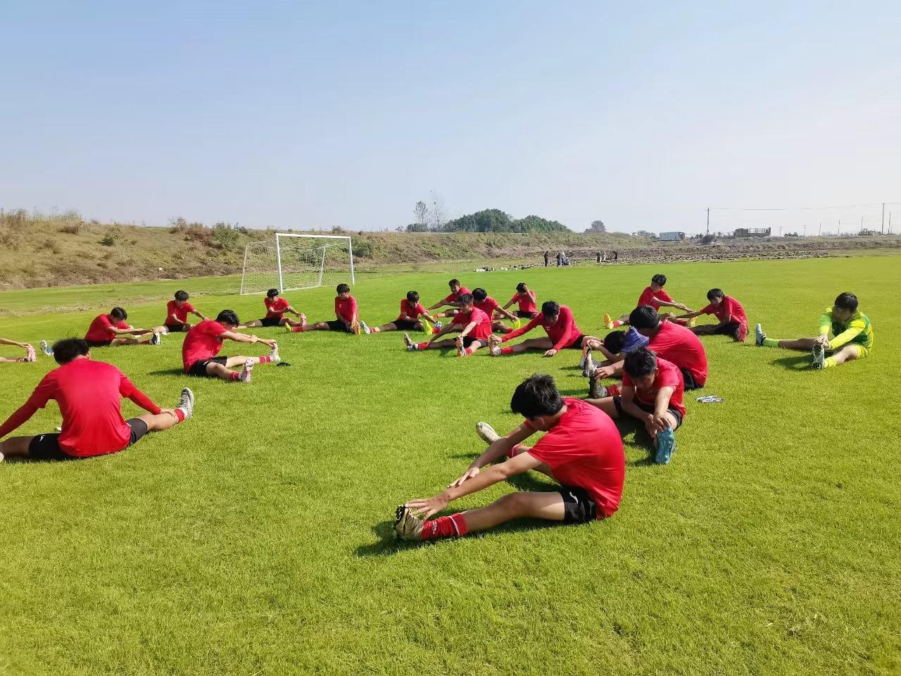 队员们在做热身训练。丰乐足球训练基地供图